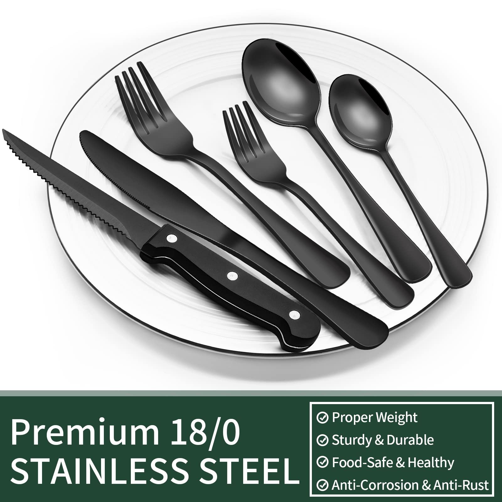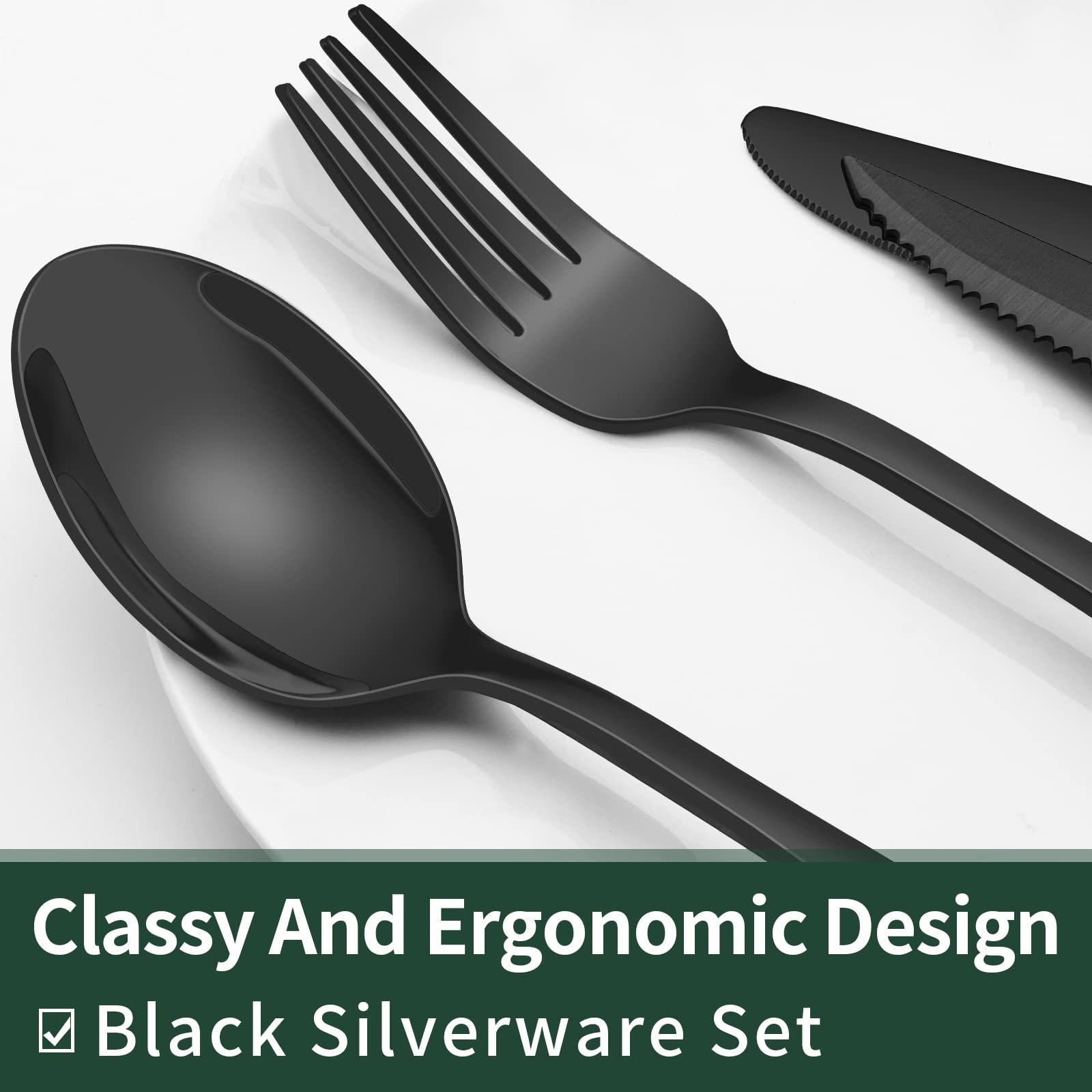 - COMFORTABLE DESIGN: This flatware set has a classic silhouette with clean lines and polish-finish surface in all black, a good choice to go with your existing tableware. The smooth edge of the handle is pleasure to hold, appropriate weight and perfect balance are added to ensure maximum comfort during use.