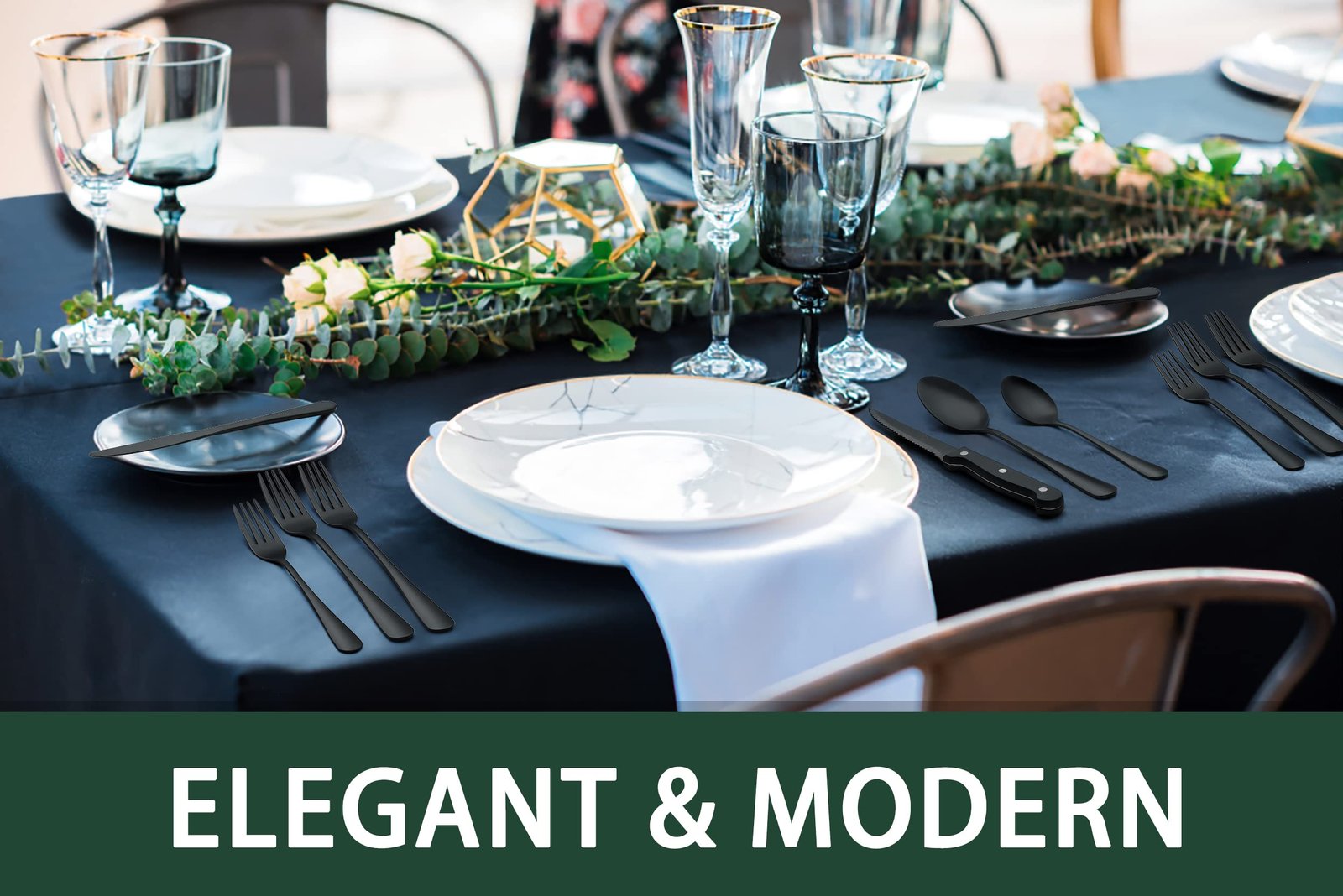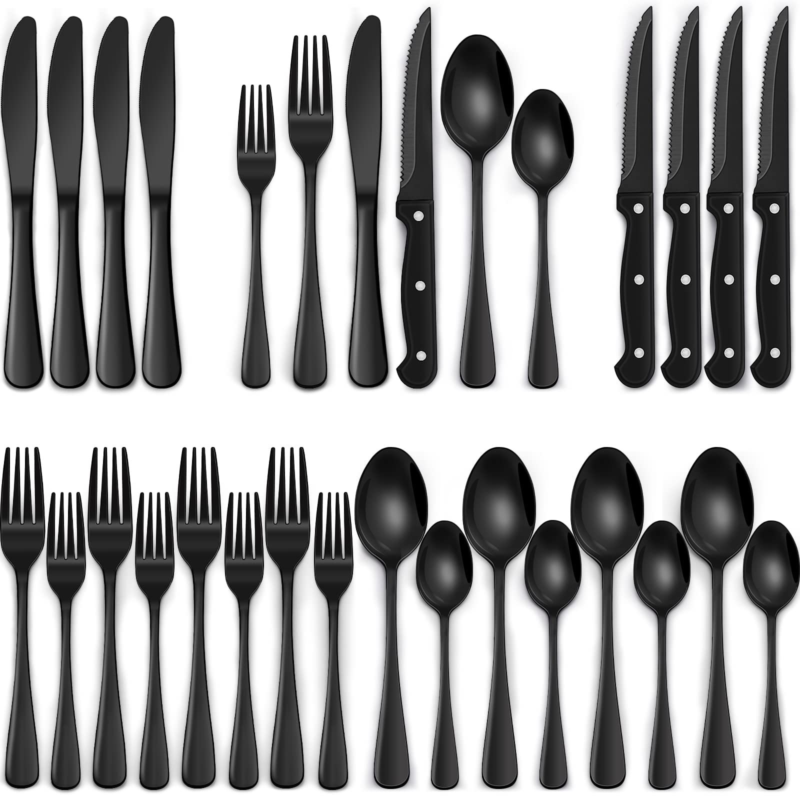 - PREMIUM 24-PIECE BLACK SILVERWARE SET FOR 4: This flatware set contains 4 dinner forks, 4 salad forks, 4 dinner spoons, 4 dessert spoons, 4 dinner knives and 4 steak knives. It’s the ideal set for home daily use, and also for restaurants, pubs, cafes, and hotels. This cutlery set also help your dinner full of design while having a party.