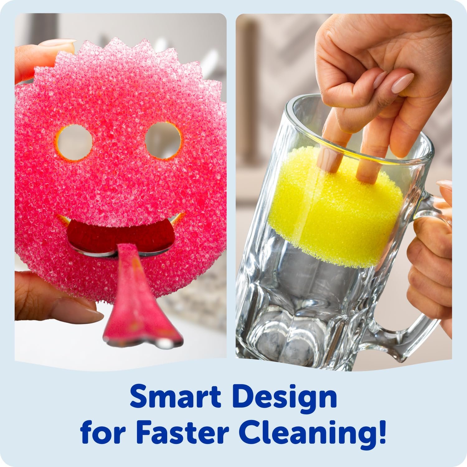- Ergonomic and Functional – Scrub Mommy is designed to fit comfortably in your hand and provide good grip and coverage so you can spend less time scrubbing and more time smiling. Her eyes hold onto you for a 360 degree reach, while her mouth cleans both sides of your utensils. No kitchen is complete without this cute and functional dish scrubber sponge.