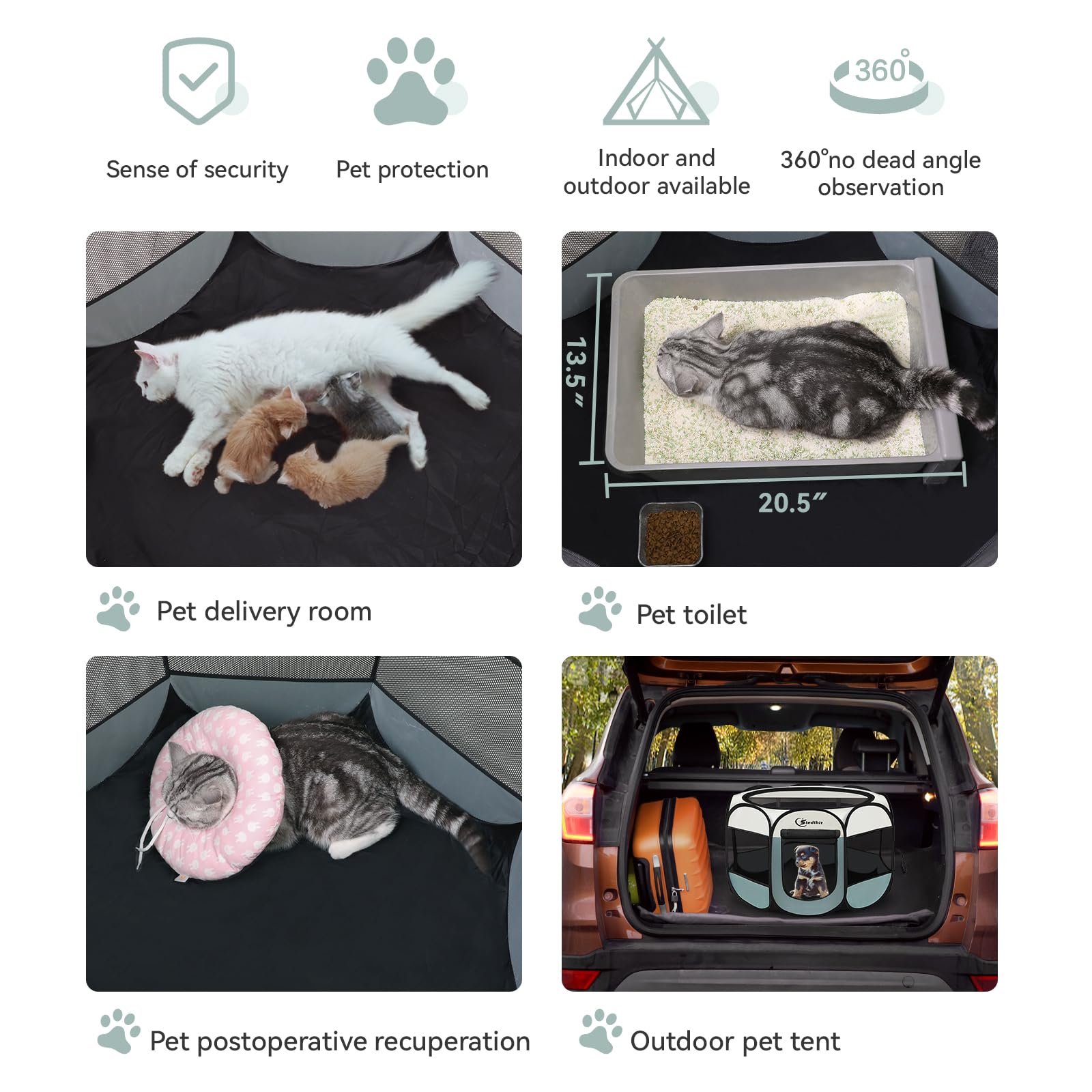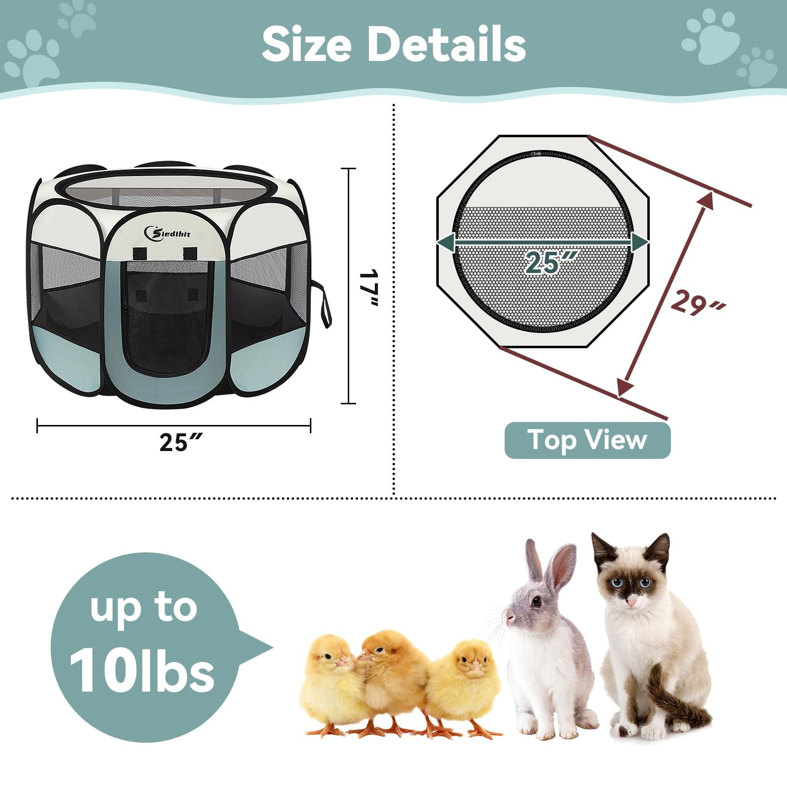 - 【No Assembly required】Opening the dog pen takes only a few seconds, is lightweight, strong, and does not require assembly. When not in use, it can be folded into the tote bag provided by us, which takes up minimal space and is easy to carry and store. Spacious interior Spaces allow your pet to play, sleep, hide or isolate. Perfect for indoors, lawns, beaches, parks, Tours, camping and more!