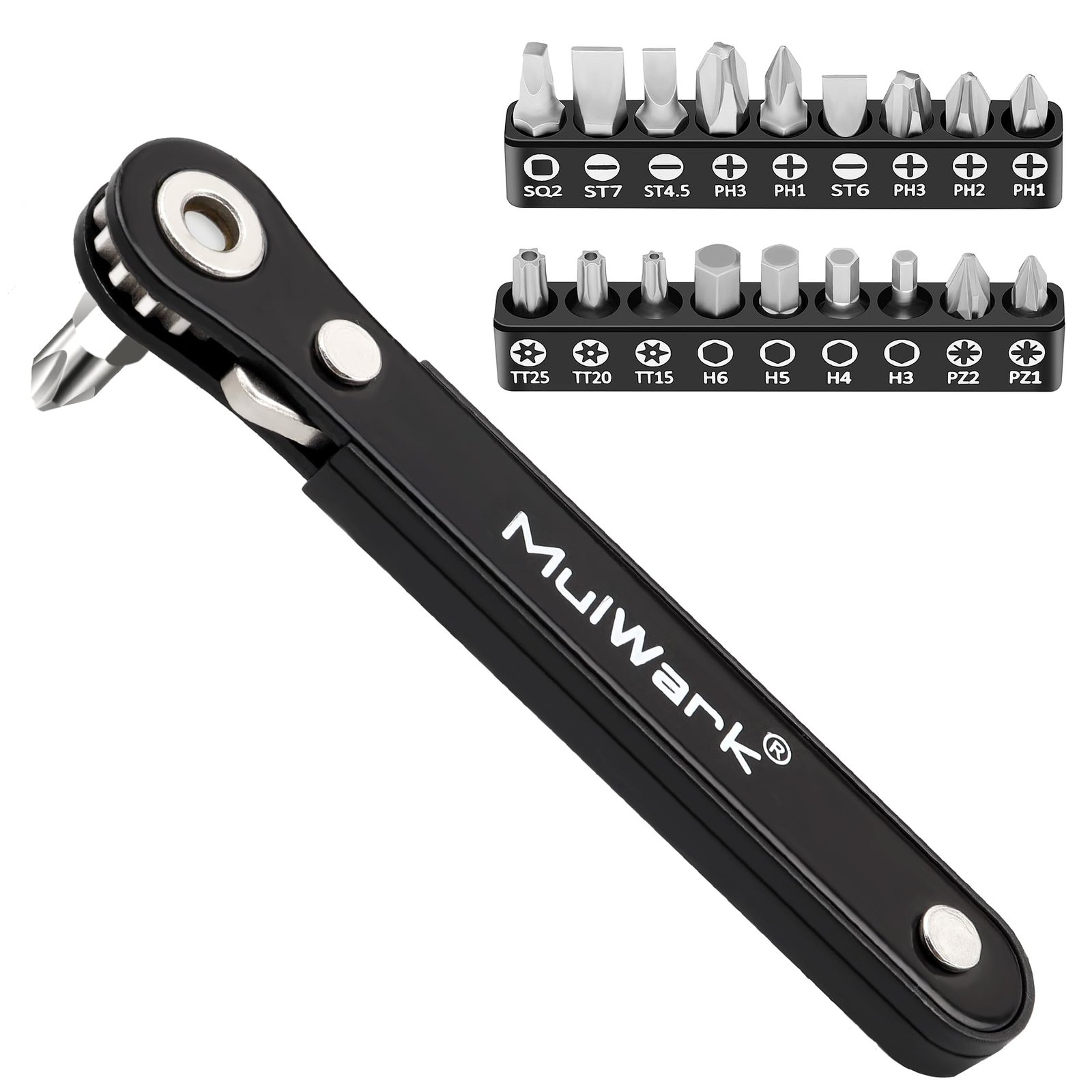- Durable 20-Piece S2 Steel Bit Set: The mini ratchet set features 6pc 25mm and 14pc 20mm bits, including Phillips (#1/#2/#3), Pozidriv (#1/#2), Slotted (4.5/7mm), Square (#2), Hex (3/4/5/6mm), and Security Torx (T15/T20/T25) types – all organized in the portable cartridges for mini ratchet sets